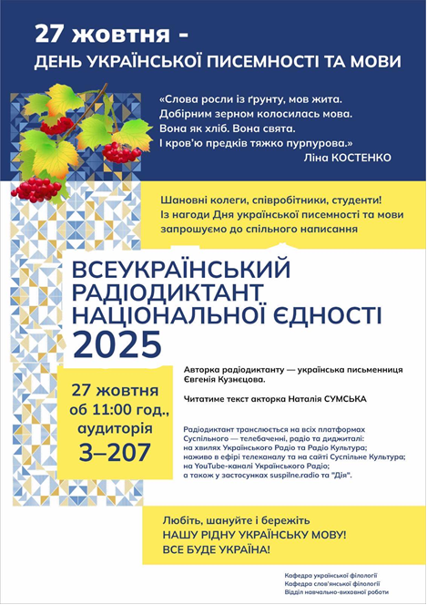 27 жовтня 2025 року у День української писемності та мови студенти-полоністи та викладачі кафедри слов’янської філології Хмельницького національного університету вкотре доєдналися до щорічної всеукраїнської акції – написання радіодиктанту національної єдності.