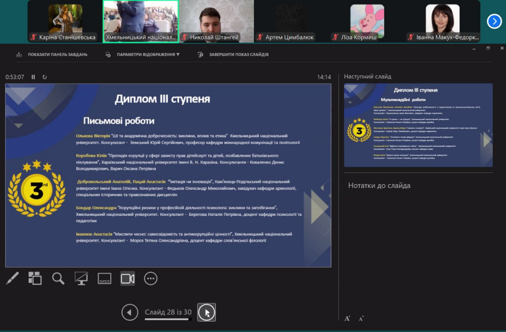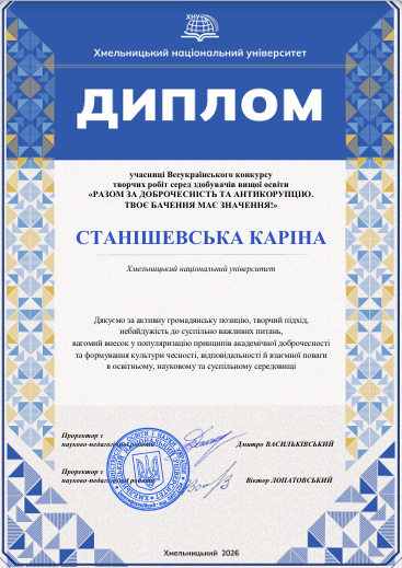 Окрему відзнаку за свою активну позицію отримала магістрантка Каріна Станішевська, яка була нагороджена Дипломом учасниці Всеукраїнського конкурсу творчих робіт. Організатори зауважили її небайдужість до суспільно важливих питань та вагомий внесок у популяризацію принципів академічної доброчесності й культури чесності в освітньому середовищі.