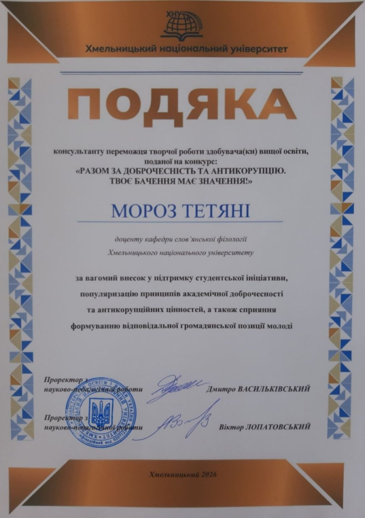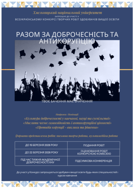 У стінах Хмельницького національного університету відбувся Всеукраїнський конкурс творчих робіт «Разом за доброчесність та антикорупцію. Твоє бачення має значення». Ця ініціатива згуртувала свідомих студентів, готових через творчість формувати культуру академічної доброчесності та довіри у рідній Alma Mater.