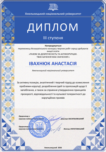 Наукові та творчі зусилля представників нашої кафедри отримали заслужене визнання на всеукраїнському рівні. Дипломом ІІІ ступеня була нагороджена Анастасія Івахнюк.