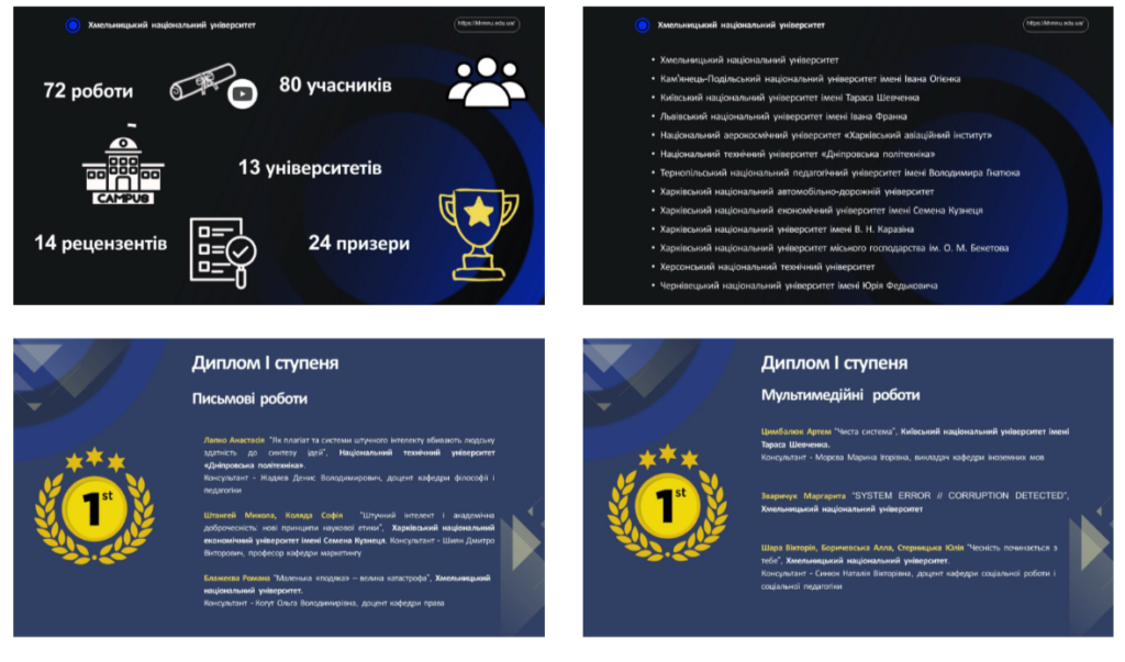 Учасницями конкурсу стали магістрантки кафедри слов’янської філології Хмельницького національного університету ОПП «Філологія. Слов’янські мови та літератури (переклад включно), перша – польська» − Анастасія Івахнюк та Каріна Станішевська (гр. ФППм-25) (науковий консультант – доцент кафедри Тетяна Мороз). Здобувачки вищої освіти другого (магістерського) рівня продемонстрували високий рівень свідомості та креативності у висвітленні питань академічної етики.