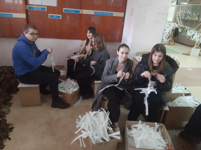 Протягом тижня студенти та викладачі кафедри плели маскувальні сітки, так необхідні для захисту наших військових на лінії фронту. Допомагати тим, хто захищає українську державу, – це наш спільний обов’язок, тому кожна маскувальна сітка – це внесок у безпеку бійців і крок до нашої спільної Перемоги.