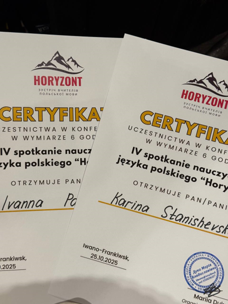 25 жовтня 2025 року магістрантки кафедри слов’янської філології Каріна Станішевська, Анастасія Івахнюк, Вікторія Савєльєва (гр. ФППм-25), які навчаються на ОПП «Філологія. Слов’янські мови та літератури (переклад включно), перша – польська», та випускниця цієї ж магістратури 2024 року Іванна Панчук взяли участь у IV Всеукраїнській зустрічі вчителів польської мови «HORYZONT», яка цьогоріч проходила в Івано-Франківську. Захід об’єднав близько 50 учасників з усіх куточків України, зокрема Хмельницького, Вінниці, Тернополя, Львова, Одеси, Рівного, Луцька, Дніпра, Коломиї, Шептицького, Здолбунова, Острога та Борисполя.