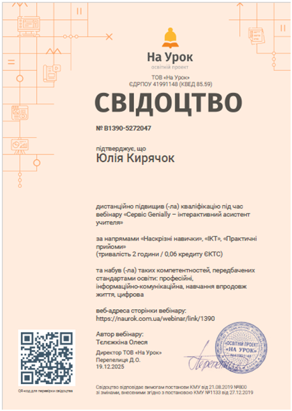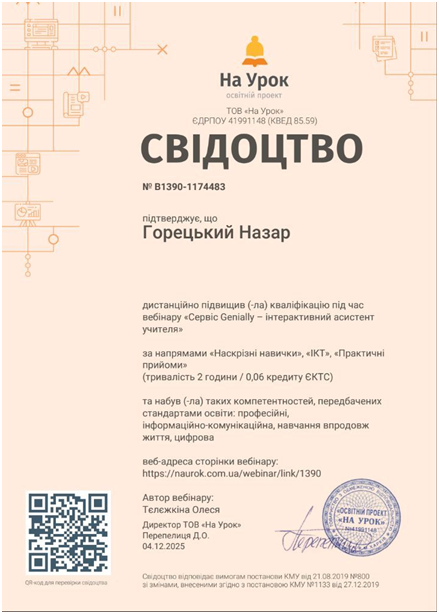 Кроком до цифрової майстерності шляхом неформальної освіти стало навчання Ороховської Лілії, Горецького Назара, Юлії Кирячок за програмою вебінару «Сервіс Genially – інтерактивний асистент учителя», про що отримані відповідні свідоцтва.