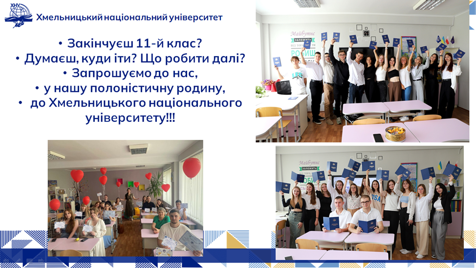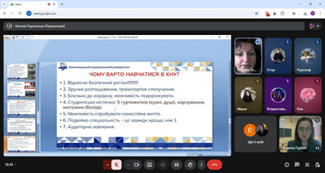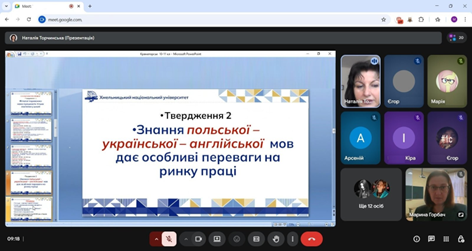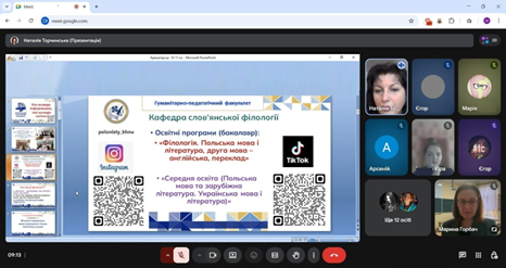 Завідувач кафедри слов’янської філології Наталія Торчинська розповіла про особливості вступу до Хмельницького національного університету і про переваги кафедральних освітніх програм «Філологія. Польська мова і література, друга мова – англійська, переклад» та «Середня освіта (Польська мова та зарубіжна література. Українська мова і література)». Особливий акцент зробила на перевагах навчання в ХНУ, серед яких і наявність гуртожитків, і студмістечко, і аудиторне навчання, яке сприяє соціалізації студентів із прифронтових районів.