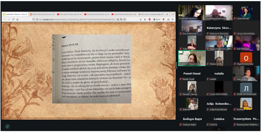 12 лютого 2026 року відбулася онлайн-зустріч «Szymborska і Filipowiczprywatna historia wielkiej literatury», організаторами якої була Kijowska Polska Młodzieżowa Asocjacja «Młodzi i Kreatywni» przy wsparciu ZPU, а спікером – Анна Моргачова, випускниця магістратури при кафедрі слов’янської філології ХНУ (2025 р., ОПП «Слов’янські мови та літератури (переклад включно), перша – польська»), яка неодноразово проводила різнотематичні вебінари для українських освітян.