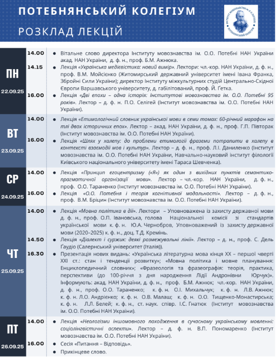 Протягом 22−26 вересня 2025 року працювала третя сесія Потебнянського колегіуму – п’ятиденної лінгвістичної школи, покликаної ознайомити всіх зацікавлених осіб з останніми здобутками мовознавчої науки, яка пройшла в онлайновому режимі за допомогою комунікаційних технологій платформи «Google Meet».