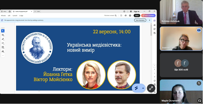 «Українська медієвістика: новий вимір». Лектори – доктор габілітований гуманістичних наук, директорка Інституту міжкультурних досліджень Центрально-Східної Європи Варшавського університету Йоанна Ґетка та доктор філологічних наук, професор, член-кореспондент НАН України Віктор Мойсієнко. Доповідачі ознайомили учасників колегіуму із найдавнішою писемною спадщиною Руси, зокрема акцентували на походженні й функціонуванні східнослов’янських мов та принесеної після хрещення Руси церковнослов’янської мови.