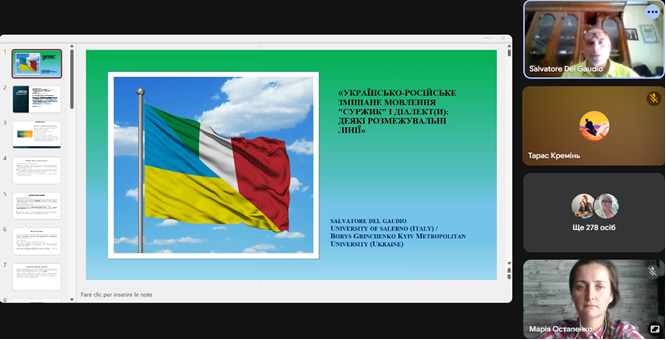 Про «Діалект і суржик: деякі розмежувальні лінії» розповів запрошений лектор – професор Салернського університету (Італія) доктор наук Сальваторе Дель Ґаудіо. Добірною українською мовою доповідач представив свої міркування з означеного питання, які викликали інтерес в аудиторії.