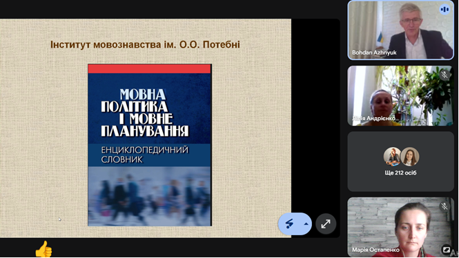 Лексикографічну працю «Мовна політика і мовне планування: Енциклопедичний словник» представили академік НАН України Богдан Ажнюк і науковці відділу мов України кандидати філологічних наук Лілія Андрієнко, Оксана Михальчук, Леся Ажнюк, Олександра Малаш і Лесь Белей.