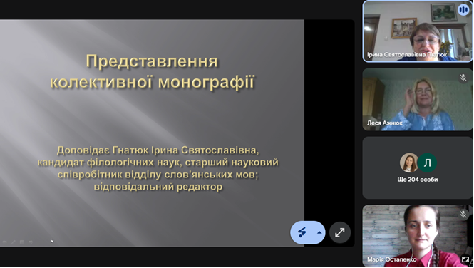Колективну монографію «Фразеологія та фразеографія: теорія, практика, перспективи (до 100-річчя з дня народження Лідії Андронівни Юрчук)» представила старший науковий співробітник відділу слов’янських мов Інституту мовознавства ім. О. О. Потебні НАН України кандидат філологічних наук Ірина Гнатюк, яка розповіла про авторів монографії, а також і про саму Лілію Андронівну. За честь, що серед авторів викладач кафедри – доктор філософії, доцент кафедри слов’янської філології Тетяна Мороз.
