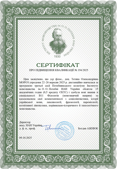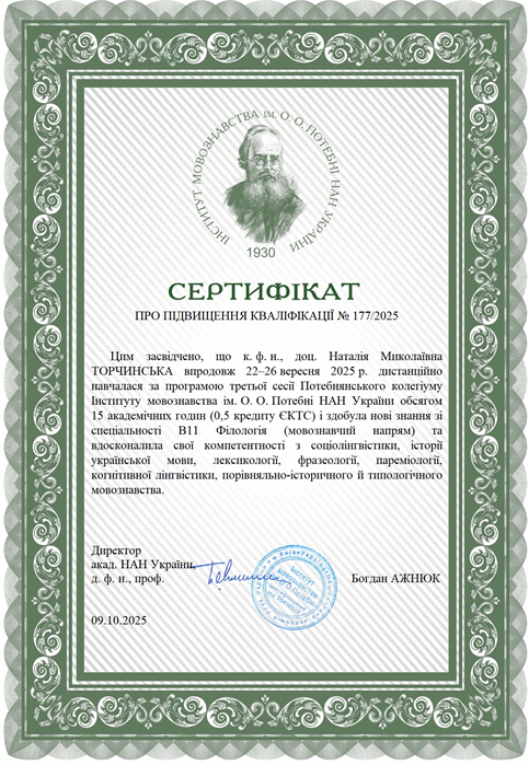 Усі учасники лінгвістичної школи «Потебнянський колегіум» отримали сертифікат підвищення кваліфікації (15 академічних годин (0,5 кредиту EKTC)).