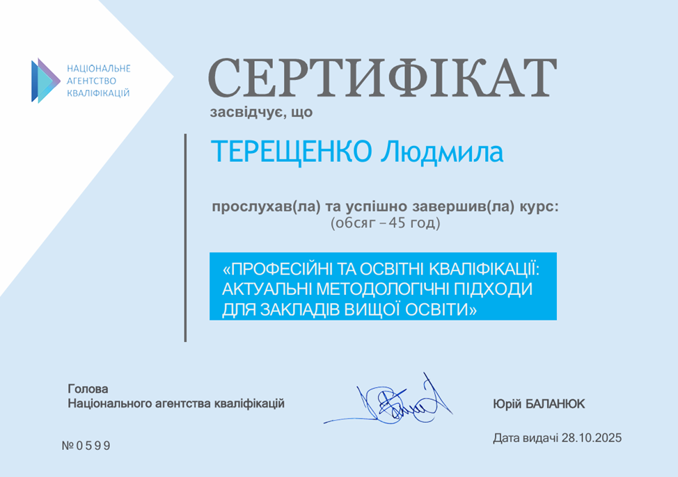 Здобутий досвід підвищення кваліфікації стане у нагоді у процесі систематизації впровадження сучасних підходів до розроблення освітніх програм, узгоджених із професійними кваліфікаціями, стандартами та європейськими рамками, підготовки до акредитаційної експертизи тощо.